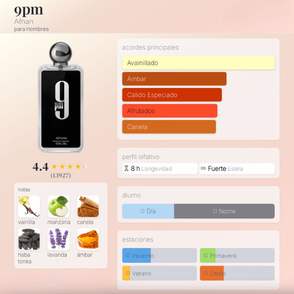 Estas notas medias añaden una capa de sofisticación y elegancia, lo que hace que 9PM sea perfecto tanto para ocasiones formales como informales.
