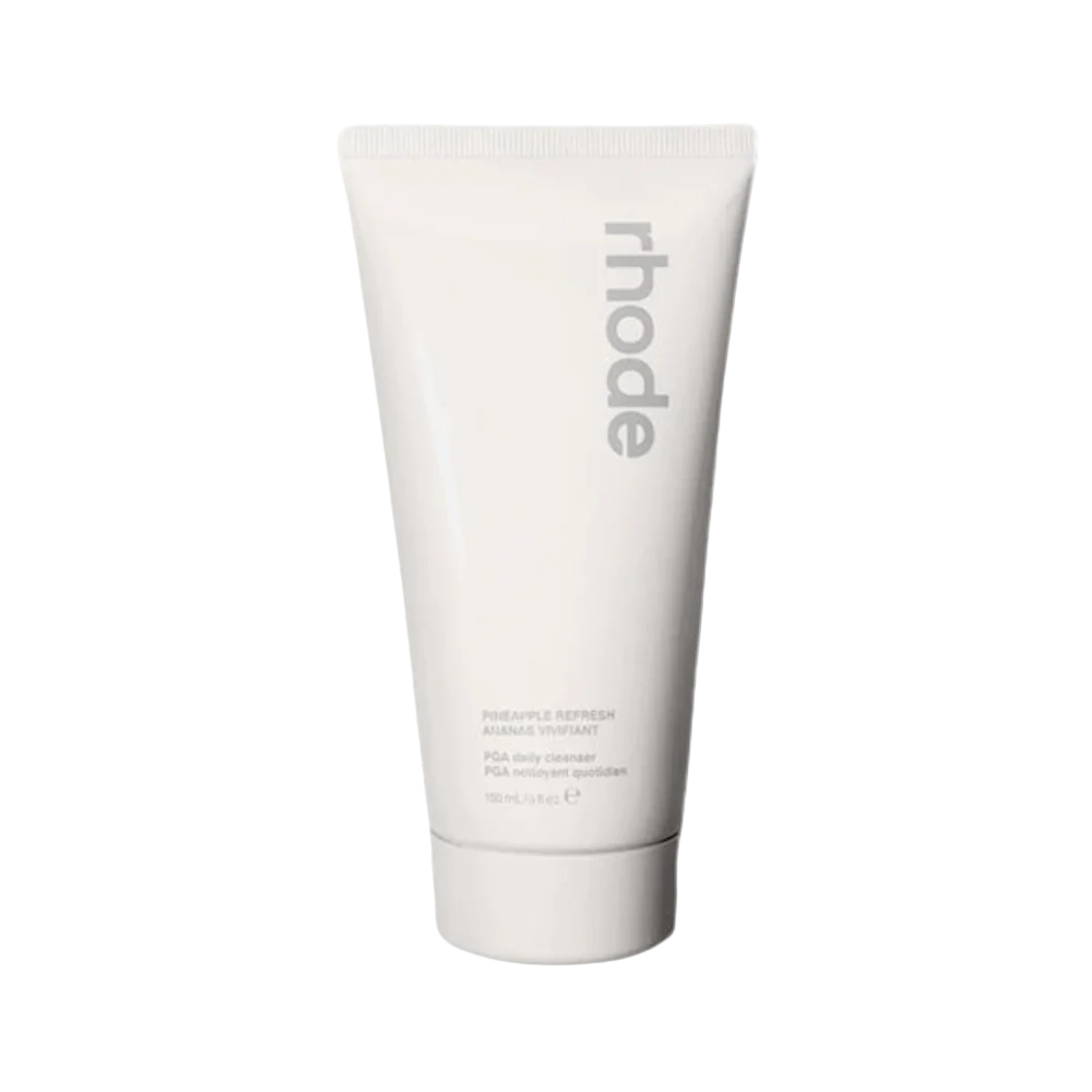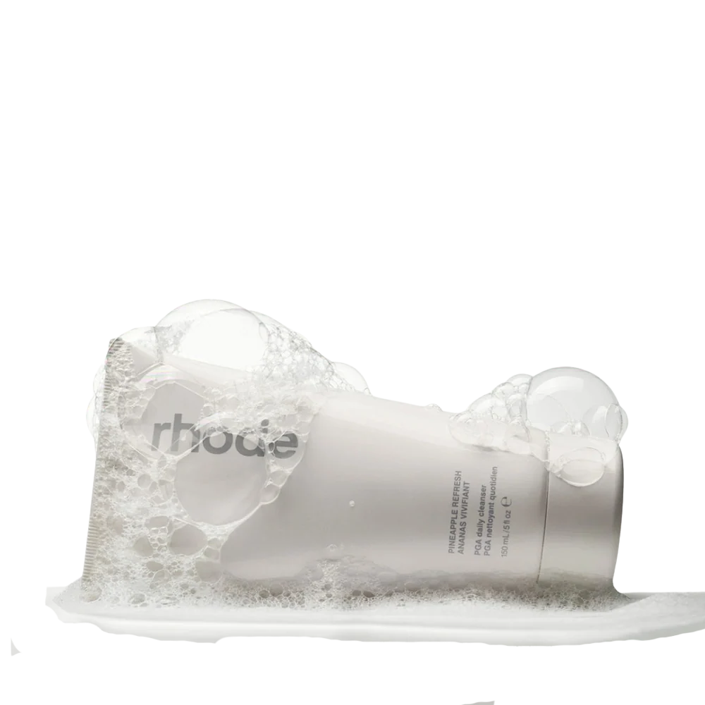 El Rhode "Pineapple Refresh" es un limpiador diario refrescante que forma bálsamo y hace espuma, formulado con ácido poliglutámico (también conocido como PGA), extracto de té verde y enzima de piña para dejar la piel limpia, suave y con vitalidad después del enjuague. Lo suficientemente suave para usar por la mañana y por la noche + seguro para pieles sensibles.